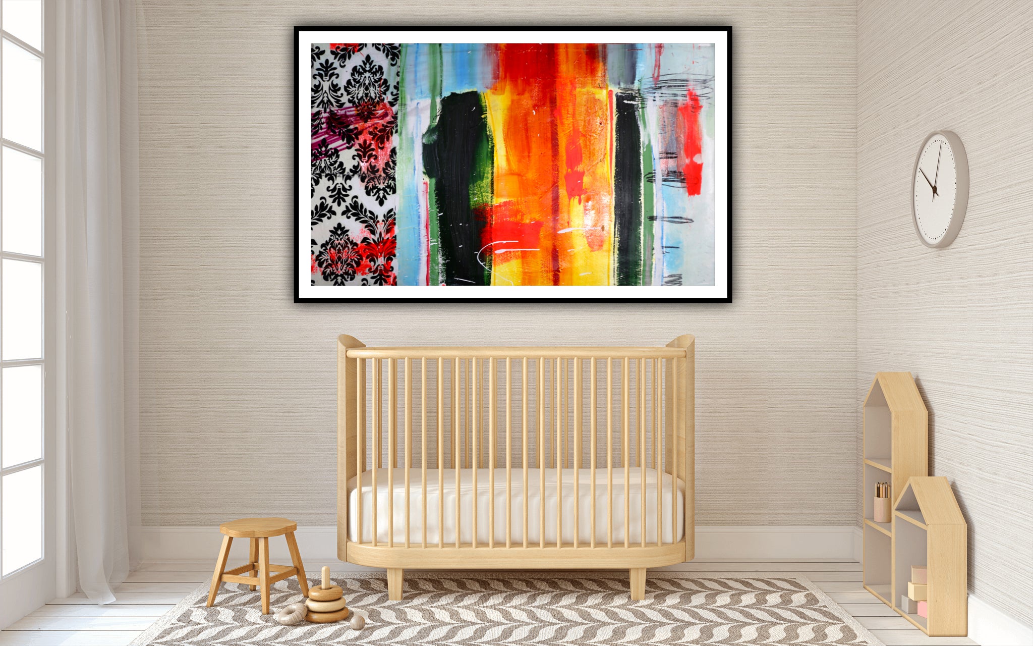 Acrylic paint, graphite pencil, demask fabric and aerosol paint on canvas